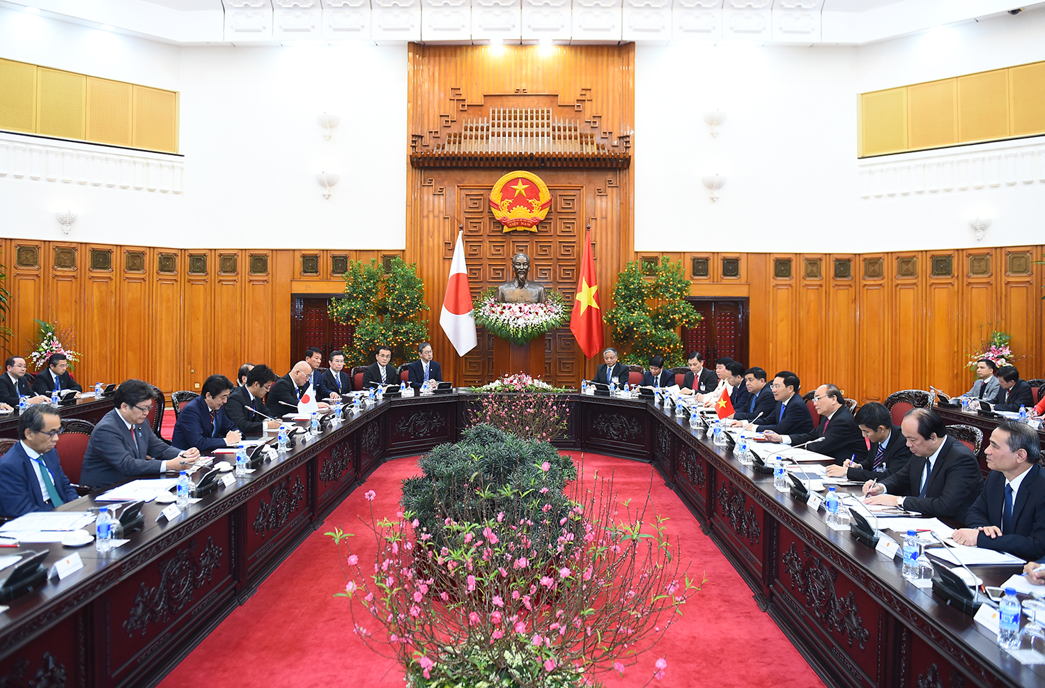 Thủ tướng Nguyễn Xuân Phúc nhiệt liệt chào mừng Thủ tướng Shinzo Abe, lãnh đạo cấp cao nước ngoài đầu tiên thăm Việt Nam trong năm 2017; khẳng định lại chính sách nhất quán coi Nhật Bản là đối tác quan trọng hàng đầu và lâu dài của Việt Nam. Thủ tướng Shinzo Abe bày tỏ xúc động khi thăm lại Việt Nam sau 4 năm; cảm ơn sự đón tiếp trọng thị của Thủ tướng Nguyễn Xuân Phúc, Chính phủ và nhân dân Việt Nam dành cho đoàn Nhật Bản; khẳng định Nhật Bản ủng hộ sự phát triển vững mạnh của đất nước Việt Nam, coi trọng và mong muốn tăng cường quan hệ với Việt Nam.