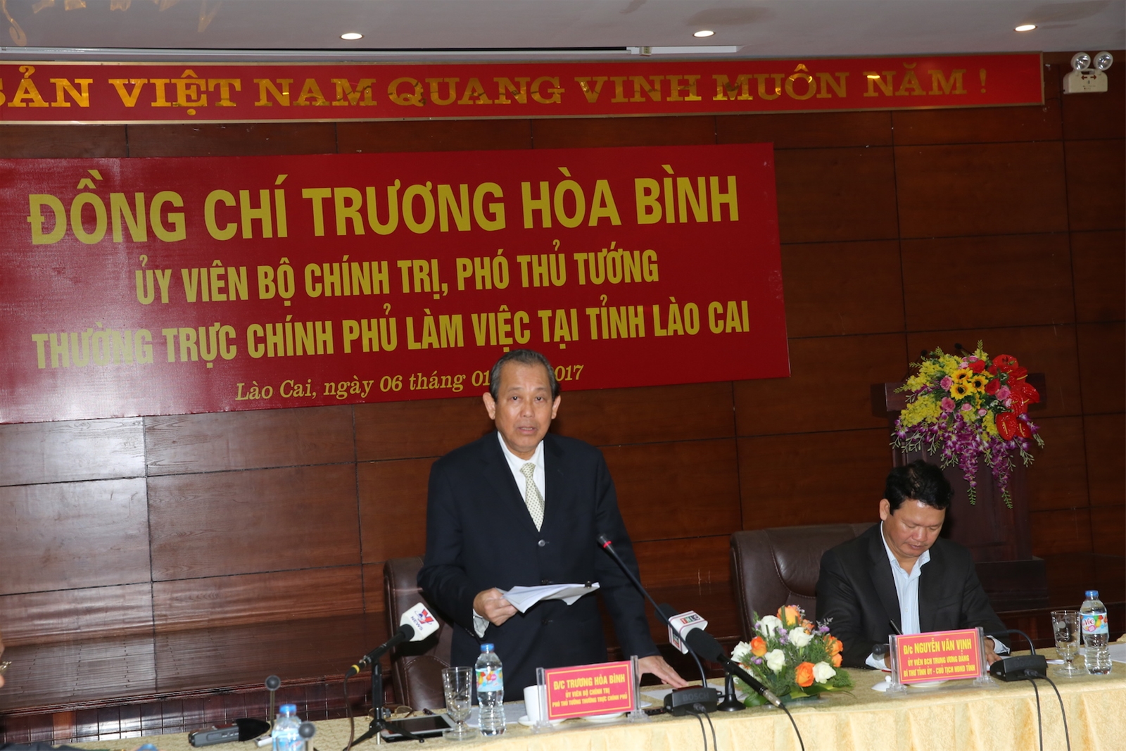 Đối với phát triển kinh tế-xã hội, Phó Thủ tướng đề nghị tỉnh Lào Cai thực hiện tốt Nghị quyết 01/NQ-CP của Chính phủ về những nhiệm vụ, giải pháp chủ yếu chỉ đạo điều hành thực hiện kế hoạch phát triển kinh tế-xã hội; quan tâm đào tạo phát triển nguồn nhân lực, từng bước tạo điều kiện thuận lợi nhất cho các nhà đầu tư, chú trọng công tác cải cách hành chính, bảo đảm quốc phòng và giữ vững an ninh chính trị, nâng cao hiệu quả công tác đối ngoại, xây dựng đường biên giới hòa bình, hữu nghị và phát triển.
