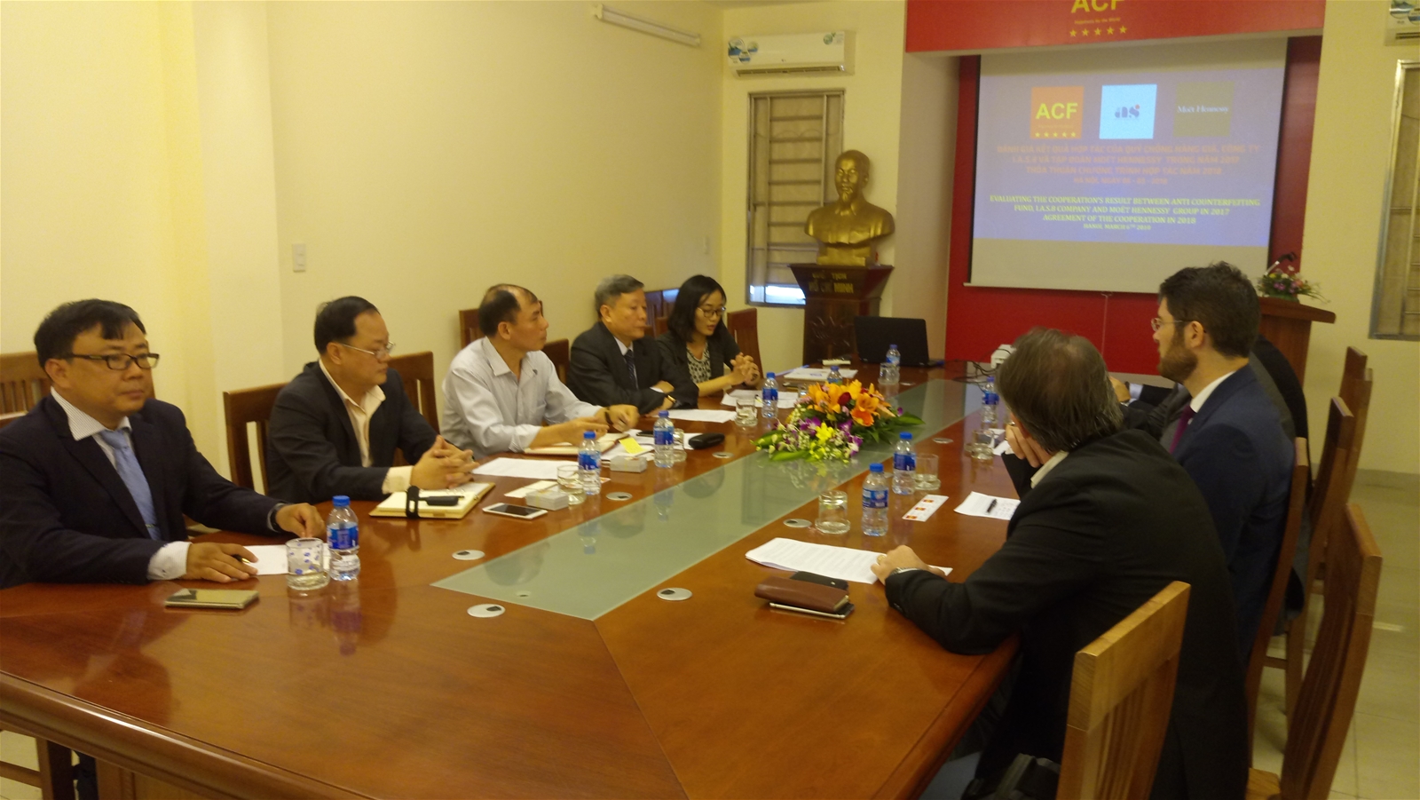 Hai bên tổng kết tình hình hợp tác, tập huấn về công tác chống hàng giả năm 2017 và đề xuất kế hoạch tiếp tục hợp tác trong năm 2018. Với vai trò chủ trì, Quỹ ACF đã báo cáo kết quả đạt được trong công tác phối hợp chống hàng giả giữa Quỹ ACF và Tập đoàn MH, đầu mối triển khai kế hoạch chi tiết phối hợp với các cơ quan chức năng của Việt Nam theo dõi, phát hiện, chu trình lưu thông sản phẩm nhằm chống sản xuất, kinh doanh rượu Hennessy giả trên thị trường Việt Nam. Đồng thời, Quỹ ACF là tổ chức thay mặt Tập đoàn MH lưu giữ, cung cấp các thông tin nhận biết, phân biệt sản phẩm rượu Hennessy qua bao bì, nhãn mác tại Việt Nam. Để triển khai công tác chống hàng giả có hiệu quả trong năm 2017, Quỹ ACF đã tổ chức 03 (ba) khóa tập huấn nghiệp vụ cho cán bộ các cơ quan chức năng tham gia công tác chống hàng giả. Các buổi tập huấn đã đem đến nhiều thông tin hữu hiệu, cập nhật, với giảng viên là các chuyên gia trong lĩnh vực chống hàng giả. Đây cũng là cơ hội để các cán bộ làm công tác chống hàng giả tiếp cận trực tiếp với thiết bị hiện đại, nhận biết để phát hiện sản phẩm rượu Hennessy bị làm giả, làm nhái.