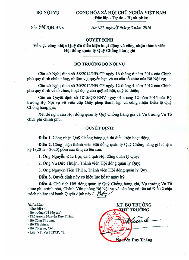 Quyết định đủ điều kiện hoạt động và công nhận thành viên hội đồng Quản lý Quỹ Chống Hàng Giả (ACF)