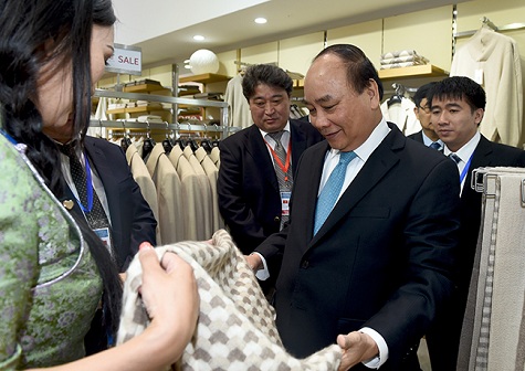 Thủ tướng Nguyễn Xuân Phúc và phu nhân tham quan khu trưng bày sản phẩm len cashmere. Ảnh: VGP/Quang Hiếu